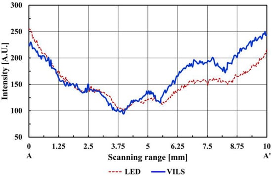 Figure 2a,b shows the finger vein images obtained using the LED array (W85I5315-C, Won semiconductor Co. Ltd, Namwon city, Korea) and the laser with the MEMS scanner, respectively. The illumination was carried out with similar optical output powers (LED array: 78.1 mW, and laser: 79.7 mW) and the field of view of the image is 12.5 mm × 12.5 mm. Figure 2b, taken with the laser source, has an apparently higher contrast than Figure 2a, taken with the LED array. To compare the clarity of the two vein patterns quantitatively, the intensity profiles were examined across the segment A-A’ (10 mm in length) for the two types of light sources in Figure 3.