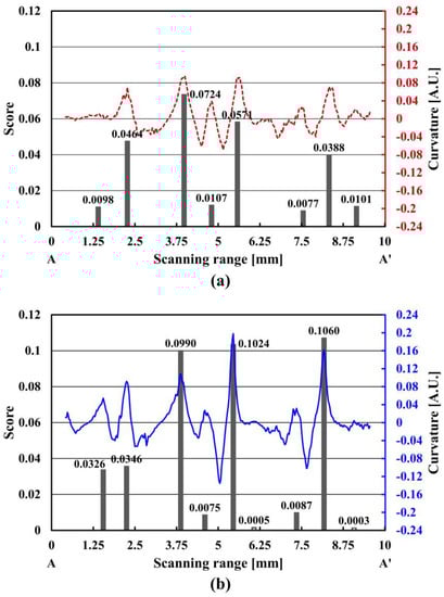 Curvature and score values in the cross-sectional profile for (a) the LED array, and (b) the VILS.