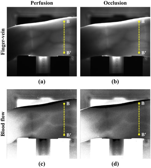 Images of the finger vein in (a) perfusion and (b) occlusion, and images of the blood flow in (c) perfusion and (d) occlusion.