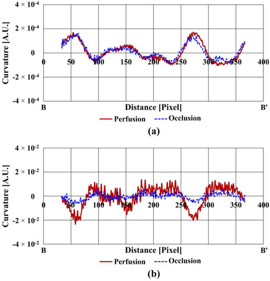 Figure 6a compares the curvatures of the finger vein in two states along the cross-sectional profile (B-B’). Figure 6b shows the curvatures of the blood flow rate (not the amount of blood) under the same condition as that for Figure 6a. The shape of the finger vein curvature in perfusion is similar to that in occlusion, whereas the absolute value (magnitude) of the blood flow curvatures is considerably larger in perfusion compared with that in occlusion, especially at the vein positions. This indicates that blood flow detection can be a powerful method to determine whether a finger is real or an imitation, because occlusion is analogous to the blood flow condition of an imitation finger.