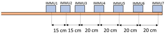 The experimental setup included 7 IMMUs (IMMU1–IMMU7) positioned on a wooden bar, as shown in Figure 1, with the aim of evaluating the influence of a magnetic field distortion introduced by a ferrous object on the accuracy of the orientation estimation as a function of the IMMU-object distance.