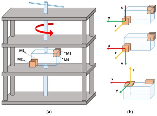 Experimental setup. (a) The structure (in gray) is rigidly connected and fixed and has the following dimensions 60 cm× 30 cm × 138 cm. The box is rigidly connected to the central bar (in blue) but free to rotate around the vertical axis. The IMMUs are shown in one of the tested configurations. The whole structure is in a plastic material; (b) IMMUs positioning to test all three axis rotations.