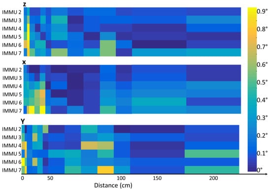 For each repetition of test B and for each distance from the poolside, the relative orientation of each IMMU with respect to IMMU 1, the farthest from the bottom of the pool and then the least affected by the magnetic field inhomogeneity, was computed in order to quantify the orientation error in a slice of the pool.