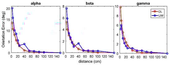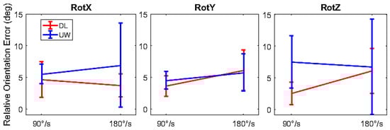 The results shown in Figure 5 revealed that the error of measurement depended on the factor’s angular velocity (p < 0.05) and settings (p < 0.05). Specifically: (i) the error generally increased with the angular velocity and (ii) the UW setting provided a larger error than that of the DL setting. For the DL setting a mean error of 4.4° was found, while for the UW setting a mean value of 6.1° was found. Thus, the difference in performance between the DL and UW settings was about 2°.