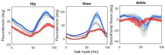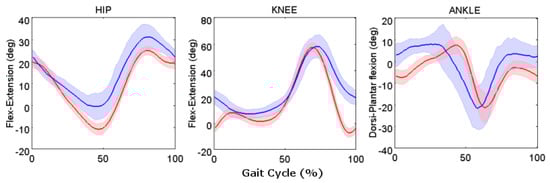 Regarding the kinematic variables, differences between DL and UW were found in flexion-extension of both the knee and ankle at heal strike and of the hip at toe-off. These findings are controversial in studies that used video cameras: some studies [58] found results similar to those we presented, while others [59] observed no differences at heel-strike and toe-off for healthy young adults. The differences found in the present paper can be explained by the surrounding conditions, i.e., walking speed of the participants and/or their height. This hypothesis is supported also by the results of the linear mixed model analysis performed [32,60]. Thus, it seems that the combination of speed and environment (on land or UW) triggered modifications in the joint angles in UW gait more than these two factors considered separately.
