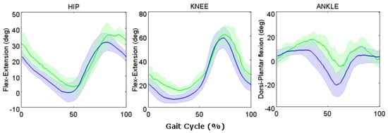 The difference found in knee and hip flexion-extension between the elderly and young adults could be explained by the effect of the walking speed in the elderly participants. For this reason, this aspect will be a matter of future investigation on a larger group of elderly participants. The kinematic analysis revealed an increase of the knee and hip flexion and a decrease of the plantar flexion in elderly participants with respect to young adults. These differences were shown by Kerrigan et al. [61], using stereophotogrammetry for walking on land, and were associated to both subtle hip flexion contracture and ankle plantar flexor concentric weakness of the elderly participants. The present preliminary results, in agreement with Barela et al. [39], showed specific UW gait patterns for elderly participants, highlighting the importance of using different joint angle normative bands accordingly to the age.