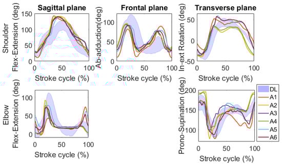 Based on the results obtained in simulated swimming, an analysis of the joint kinematics of front-crawl in a 25 m swimming pool was then carried out. Even if no validation was carried out in the UW joint kinematic analysis, the results of the instrumental validation proposed in Section 2, allow for the application of the model and the type of analysis validated for DL settings also in UW settings, during front crawl. The main difference between the simulated and UW front-crawl was a greater ab-adduction of the shoulder in the frontal plane during the underwater phase of the stroke cycle. The pattern of the UW setting is the typical pattern of a curvilinear arm pull, whereas the pattern of the DL setting is typical of a straight arm pull. The curvilinear arm trajectory is due to the drag and lift forces of the water that the athletes have to create for the generation of a more efficient hand propulsion, so it is not visible in DL [63].