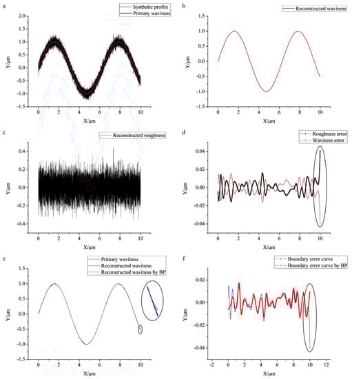 Figure 2a displays the simulated surface profile including waviness and roughness. Figure 2b exhibits the separated waviness (also the filtering reference line), and Figure 2c shows the reconstructed roughness by WPT. The error curves are given in Figure 2d, where the red line represents the differences between the reconstructed waviness and primary waviness, and the black line denotes the errors between the reconstructed roughness and primary roughness, as it can be found that the waviness and roughness obtained by WPT match well with the primary waviness and roughness. At the end of two curves, an outlier marked in a circle indicates that border deformation appears. Figure 2e presents the primary waviness (black line), reconstructed waviness (red line), and reconstructed waviness after BP (blue line). The inset of the enlarged drawing illustrates that the reconstructed waviness by BP almost keeps the same as the primary waviness, whereas some deviations exist between the primary waviness and reconstructed waviness without BP. The error curves given in Figure 2f exhibit the effect of BP clearly, in which the red line represents the errors between the primary waviness and reconstructed waviness by BP, which has a relatively smaller absolute value at the end than the blue line (the errors between the primary waviness and reconstructed waviness without BP). Obviously, the boundary deformation is eliminated.