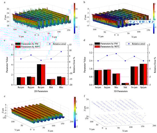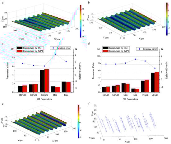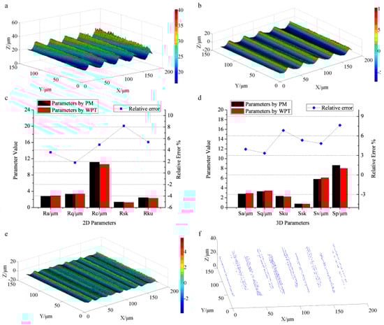 Figure 4 displays the analyzed results of the milled surface. Figure 4a illustrates the surface topography, and Figure 4b displays the roughness surface reconstructed by WPT. The profile roughness parameters and their relative errors are exhibited in Figure 4c. The values of Ra, Rq, Rc, Rsk, and Rku calculated by WPT are 1.56 μm, 1.89 μm, 5.33 μm, 1.23, and 2.30. Those measured by PM (1.48 μm, 1.81 μm, 5.12 μm, 1.36, and 2.45) are used for comparison. It can be seen that the profile roughness parameters obtained by WPT approximate to those measured by PM. The relative errors are 5.41%, 4.42%, 4.10%, 9.56%, and 6.12%, respectively, indicating that the characterization results obtained by WPT agree well with those by PM. The largest deviation appears in Rsk, which measures the asymmetry of the probability density function of the ordinate values, strongly influenced by the noise in the measurements. The corresponding areal roughness parameters together with the relative errors are shown in Figure 4d. Sa, Sq, Sku, Ssk, Sv, and Sp by WPT are 1.57 μm, 1.92 μm, 2.33, 0.92, 3.44 μm, and 5.65 μm. For comparison, the results by PM are 1.48 μm, 1.81 μm, 2.49, 1.00, 3.21 μm, and 5.41 μm. The relative errors of Sa, Sq, Sku, and Sp (6.08%, 6.07%, 6.43%, and 4.43%) are less than 7%. However, the difference of Sv reaches 7.16%, and the relative error of Ssk even approaches 8.00%. Sv measures the largest surface valley depth with a sampling region. Ssk evaluates the asymmetry of the probability density function of the ordinate values. Noisy points introduced in the measurements will result in large deviations of Sv and Ssk.