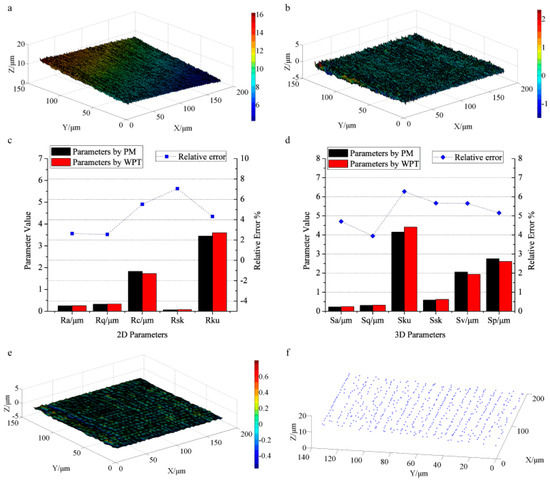 The characterized results of the grinding surface: (a) the primary surface topography by CLSM; (b) the roughness topography obtained by WPT; (c) the profile roughness parameters and their relative errors calculated by PM and WPT; (d) the areal roughness parameters and their relative errors obtained by WPT and PM; (e) the smoothed surface topography by WPT; (f) the extracted 532 feature points of surface texture.