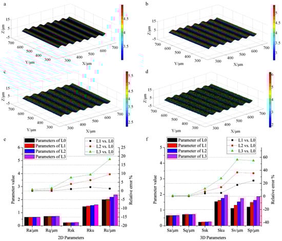 Figure 7a–d show the simulated surfaces with level-0, level-1, level-2, and level-3 noise, respectively. Figure 7e displays the evaluated results of the profile roughness of every surface (the black, red, blue, and pink bars represent the results of the surfaces with level-0, level-1, level-2, and level-3 noise, respectively, and the black, red, and green dot lines signify the relative errors of the surfaces with level-1, level-2, and level-3 noise vs. those of the surface with level-0 noise, respectively). The results (Ra, Rq, Rsk, Rku, and Rc) of the surface with level-0 (0.65 μm, 0.72 μm, 0.23, 1.47, 2.00 μm), level-1 (0.65 μm, 0.72 μm, 0.23, 1.50, 2.03 μm), level-2 (0.65 μm, 0.72 μm, 0.24, 1.56, 2.19 μm), and level-3 (0.6558 μm, 0.73 μm, 0.25, 1.60, 2.36 μm) noise are calculated. Accordingly, the relative errors (Ra) of the surfaces with level-1, level-2, and level-3 noise vs. that of the surface with level-0 noise are 0.046%, 0.31%, and 0.78%. The relative errors of Rq (0.097%, 0.61%, and 1.57%), Rsk (1.09%, 4.00%, and 7.65%), Rku (2.18%, 6.20%, and 9.41%), and Rc (1.32%, 9.60%, and 18.24%) are also illustrated as the dot lines. As can be found, the skewness (Rsk), kurtosis (Rku), and the mean height (Rc) increase drastically with the noise increasing from level-0 to level-3, explaining that the parameters (Rsk, Rku and Rc) are influenced by noise much stronger than Ra and Rq. This leads to relatively large deviations of Rsk, Rku, and Rc by WPT and PM.