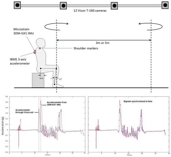 During each TUG trial, participants’ movement kinematics were recorded using two synchronized data acquisition systems: (1) A 12-camera Vicon T160 optoelectronic motion capture system; and (2) A 9-axis Microstrain 3DM-GX1 inertial measurement unit (3-axis accelerometer, 3-axis gyroscope, and 3-axis magnetometer). Synchronization was accomplished by fixing an independent analog 3-axis accelerometer to the 3DM-GX1 case that was directly connected to the Vicon system’s analog-to-digital converter and stored in the output C3D motion data files.