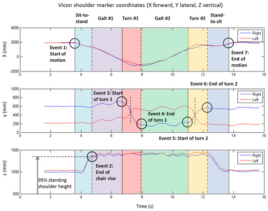 Motion capture with the optoelectronic system (sample rate of 100 Hz) followed standard calibration procedures, including a static standing test, conducted prior to and after the TUG session. Preliminary testing indicated that only two reflective markers—on the right and left acromion processes (shoulders)—were required to detect all relevant events of the TUG, as detailed below. The 3DM-GX1 with attached accelerometer (both sampling at 1000 Hz) was securely fixed to the torso of the participant at approximately the T2-T3 spine level (between the shoulder blades), as illustrated in