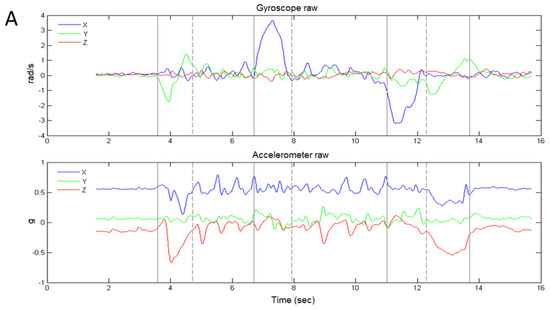 Figure 3a shows the raw sensor signals for the gyroscope and accelerometer during the TUG, and