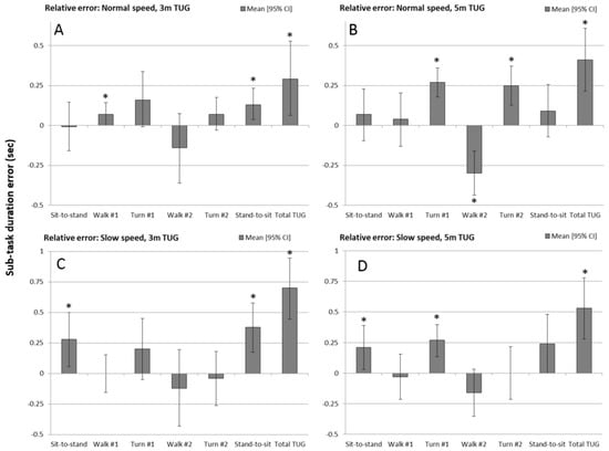 Table A1). Positive values indicate that the sensor measured values lower than the gold-standard. Bar charts include 95% confidence intervals (whiskers) and the asterisks indicate which sub-task duration measures were significantly different from zero.