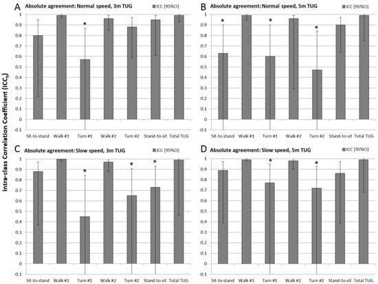 Total TUG time and both walk times were found to have excellent absolute agreement (ICCb > 0.95) for all four experimental conditions. For chair activities the ICCb values ranged between 0.80 and 0.95 for three of the four experimental conditions, but lower (0.6) and non-significant (CI included zero) for the 5 m TUG at normal speed. Turns were found to be in poor to no agreement with all but one instance (turn #2 for 3 m normal speed TUG, ICCb = 0.88) having very low ICCb values (0.4–0.75) with CI boundaries that include zero.