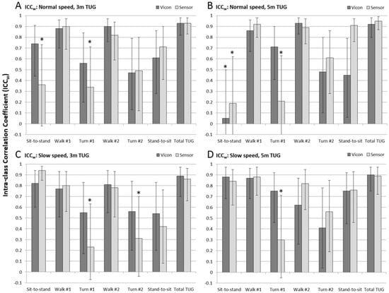 Table A2) for measurements from the marker-based analysis (Vicon, dark gray bars) and the IMU-based analysis (Sensor, light gray bars). As above, whiskers represent the 95% confidence interval, and the asterisk represents the ICC