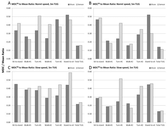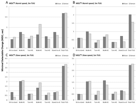 24]. What is striking is that the MDC we computed for the total TUG time, for both the sensor-based measurement as well as the marker-based “gold-standard” measurement, ranged between 1.5–2 s for normal speed trials and 3–4 s for slow speed trials. This is in excellent agreement with the published literature on the MDC of the clinical TUG test when using a stop watch, but also suggests that the variability within subjects repeating the test is a greater source of error than the measurement technique itself. The further implication is that adopting IMU-based measurement systems for timed tests of physical function may not necessarily improve our ability to detect meaningful change in the test’s output metrics.