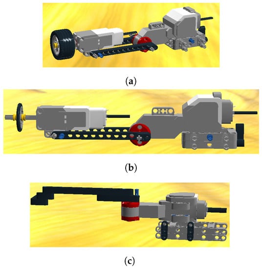 Two robotic arms have been built. The lifting arm has the function of handling a page. The turning arm is responsible for turning the page. In comparison with the Bookreader 2 project, the lifting arm includes a large servo motor for allowing both up and down movements. These movements will handle the pressure on the page, contributing to a finer page selection and to the recovery method in case of a bad page selection. Furthermore, the pressure handling allows a higher degree of precision when working in an inclined scenario. In our platform, we have also considered a thin wheel, as shown in Figure 2b, for selecting glossy and lightweight pages. This type of page presents less precision when using the conventional thick wheel described in Figure 2a. The turning arm consists of a large Lego studless beam joined to a large servo motor and other small pieces. Its design is depicted in Figure 2c.