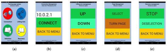 Screenshots of the user interface proposal. (a) Main menu; (b) Connection menu; (c) Lifting arm control; (d) Page selection options; (e) Recovery options.