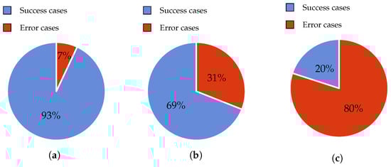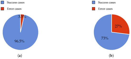 In this experiment, 200 observations were conducted in order to obtain the error rate. This experiment was tested with 80 gr/m and A4 size paper. The A4 paper was selected because nowadays it is the most extended for commercial use. In fact, this format is very similar to the size of old book pages (big fonts and images) that elderly people usually read. The results are shown in Figure 4a. When using the proposed design, i.e., thick wheels, we achieved 193 successful cases in contrast to seven failures. The error rate was thus 3.5%. Five of these failures were solved by deselecting and selecting the page once again. The remaining two errors were solved by moving the roller down to apply more pressure.