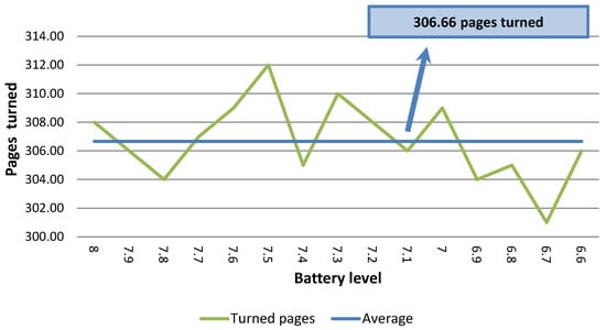 The main objective of this experiment is to establish the number of pages that can be correctly turned before recharging the battery. We should mention that the EV3 battery voltage level ranges from 8.0 to 6.5, where 8.0 indicates that the battery level is high while 6.5 is the lowest battery level prior to turning off the EV3 brick. Hence, at this level, the battery needs to be recharged.