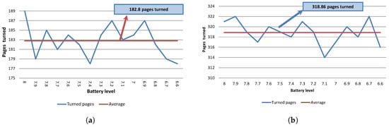 Battery consumption for 65 gr/m pages. (a) Battery usage with the thin wheel model and glossy pages; (b) Battery usage with the thick wheel model and non-glossy pages.