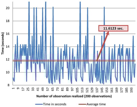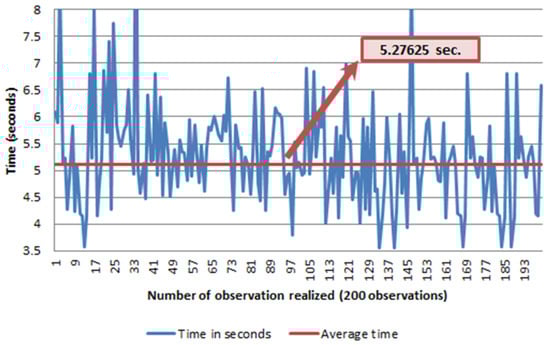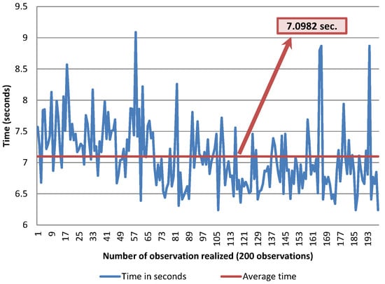 The thick wheel model was tested with 200 observations (only successful turning cases), using 80 gr/m and A4 sized pages. The time was measured in seconds, using a chronometer. The overall elapsed time is measured from the page selection action to the moment when the lifting arm has completed its downwards movement after turning a page. The average time obtained is 7.1 s per page, which means that the system is able to turn around 507 pages per hour. These results are shown in Figure 8.