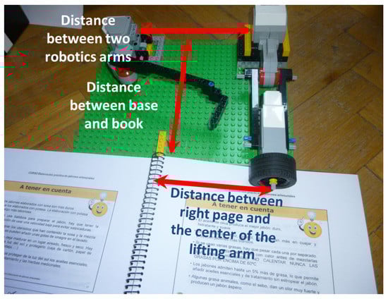 The distance between the robotic arms is set to 15 cm, and the distance between the book and the Lego base is set to 19 cm. The reason for using these distances is the fact that, with other values, the book is damaged when turning pages or the wheel position obstructs the view of the pages. With a larger distance, we have observed that it is not possible to correctly perform page selection with A4 sized pages.