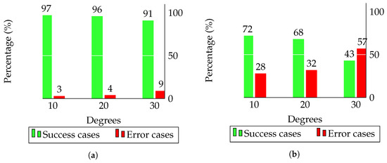 Error rate on a 10 , 20 and 30 degree inclined surface. (a) Thick wheel model; (b) Bookreader 2 model.