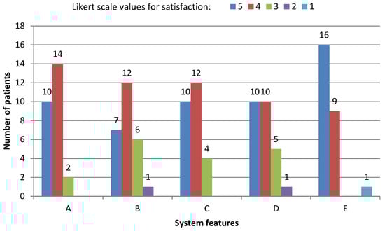 In Figure 13, the user satisfaction breakdown can be observed. According to both Table 2 and Figure 13, the degree of satisfaction ranges from 4 to 5 for the majority of the patients. Only three system features were given less than 3 points by the same patient. This patient presents a low level of ET, as his associated part C FTM value is 5. In fact, he just needed 32 s to turn the 10 pages. Consequently, the low rating given to the system features can be understood as an outlier. Thus, in general, it is possible to establish a correlation between the time to turn the pages and user satisfaction, obtaining a higher level of satisfaction as the time to turn the 10 pages increases, especially concerning the system’s speed (question B).