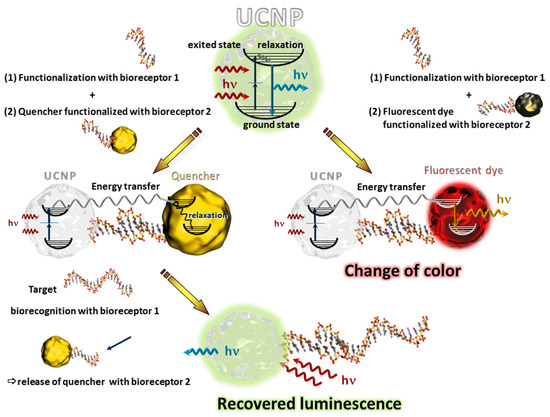 - Su, Q.; Feng, W.; Yang, D.; Li, F. Resonance Energy Transfer in Upconversion Nanoplatforms for Selective Biodetection. Acc. Chem. Res. 2017, 50, 32–40. [Google Scholar] [CrossRef] [PubMed]
