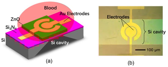 (a) The configuration of the film bulk acoustic resonator (FBAR)-based coagulation monitoring sensor; (b) the micrograph of the fabricated device.