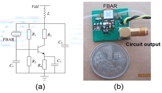Based on the fabricated FBAR device, an oscillator was assembled to realize a portable system for the real-time monitoring of whole blood coagulation. As shown in Figure 3, the FBAR device functions as an inductor in the oscillator circuit. The effective inductance of the resonator, C1 and C2, determines the oscillation frequency. The bipolar junction transistor (NE68119, Agilent, Santa Clara, CA, USA) is biased by R1, R2, R3 and C3. The oscillator output was connected to a network analyzer (Agilent 8714 ET, Agilent, Santa Clara, CA, USA) via a standard 50 Ω cable, and the data were processed by another computer.