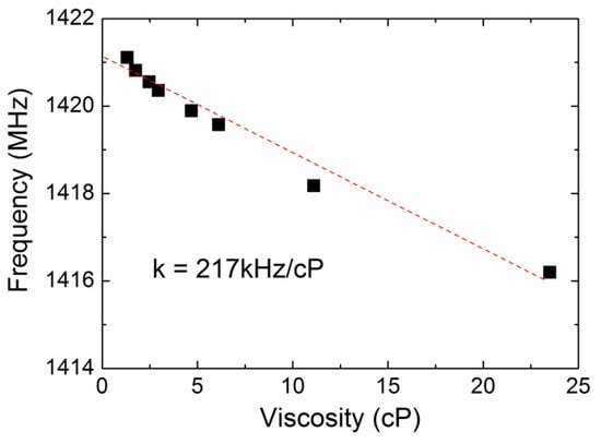 The resonant frequency of the FBAR device as a function of the liquid viscosity at room temperature.