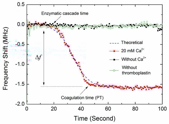 According to the extrinsic pathway of blood coagulation, the coagulation process mainly covers in turn the stages of cascade enzyme reaction, the fibrin formation and polymerization. The enzymatic cascade occurs first after the blood is activated by Ca2+ ions and thromboplastin. In this stage, thromboplastin (tissue factor) activates factor VII, which in turn leads to an activation of factor X. Together with activated factor V, Ca2+ ions and phospholipids-activated factor X form the prothrombinase complex. This complex catalyzes the conversion of prothrombin to thrombin. There are no obviously viscosity changes occurring in the first cascade enzyme reaction [], resulting in the first plateau phase of resonant frequency. Then, thrombin as the central protein in the coagulation cascade cleaves fibrinogen to fibrin. The fibrin monomers polymerize into fibers, and the blood clot eventually forms. Consequently, the increase of liquid viscosity and the continuous formation of fibrin fibers result in that the resonant frequency gradually drops to a relatively low value and reaches a steady state at last, as shown in Figure 7. In the clinical applications, the end time of fibrin polymerization is determined as the prothrombin time.