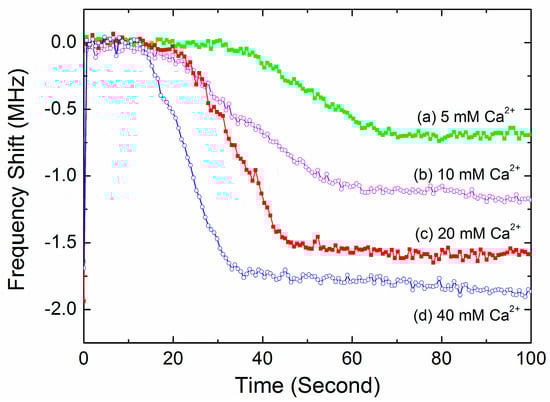 The typical time-dependent frequency profiles of the FBAR device for the blood samples activated by different Ca2+ ion concentration.