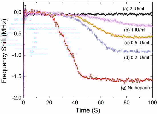 In clinical practice, heparin is a typical anticoagulant drug to treat and prevent blood clots. Heparin binding to thrombin alters the affinity towards fibrinogens, which inhibits the fibrin formation and thus slows down the coagulation process. In this work, the FBAR sensor was used to demonstrate the anticoagulant effect by adding heparin to the blood samples. Figure 9 shows the representative time-dependent resonant frequency profiles for different heparin concentrations. The shapes of the frequency profile were closely dependent on the heparin concentration. In particular, when an excess quantity of anticoagulant was added in the blood sample, no coagulation process was observed during the test time. Based on the fitting Equation (4), the coagulation parameters were obtained from the frequency response as summarized in Table 3. Obviously, the presence of heparin results in lower reaction rates and smaller frequency downshifts because of the inhibiting effect of heparin on the blood coagulation.