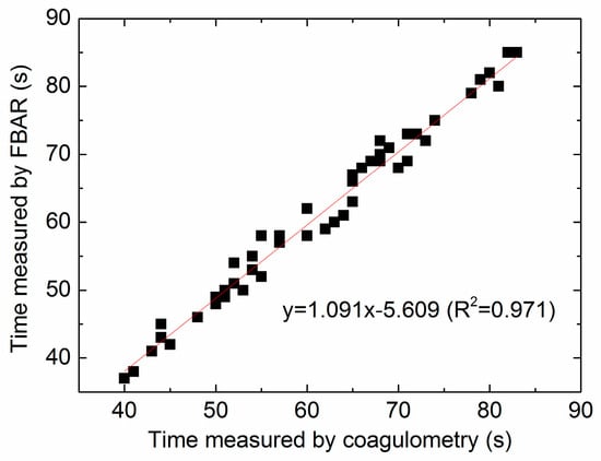 In order to validate this new measurement technique, the blood samples from six healthy donors were studied. Figure 10 shows the correlation between the PT values determined by FBAR sensor and the results acquired by the commercial coagulometric method. The blood samples were activated by different concentration CaCl2 or added with different concentrations of heparin. Importantly, in all of the coagulation time analyses done in this study, it is found that the correlation (R2) of the two methods was 0.971, where R2 = 0 indicates that the FBAR sensor is fully inaccurate, and R2 = 1 represents a perfect measurement. Therefore, the coagulation time determined from the time-frequency profiles of the FBAR sensor (corresponding to 95% of Δf) can act as a reliable quantitative end point of the coagulation assay. In comparison, the correlation values corresponding to 90% and 100% characteristic points are 0.913 and 0.892, respectively.