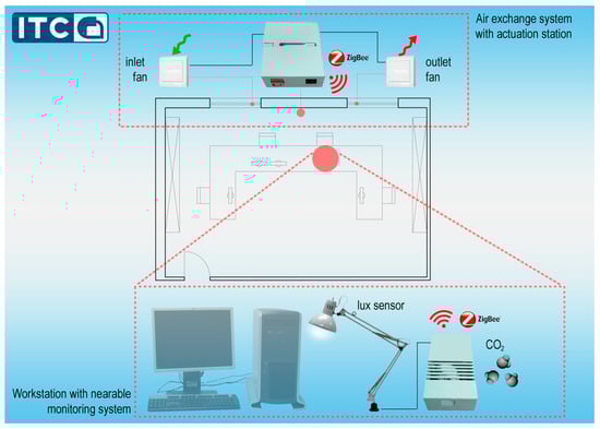 The system was installed in an office, located on the first and top floor of a building, with an area of about 42 m2 (7.81 m × 5.37 m) normally occupied by four workers (Figure 6a). A carbon dioxide (CO2) concentration sensor and a lux meter (LX) were installed in the office close to the workplace where the IAQ and ILQ are analyzed (Figure 6b). Both sensors were placed on the desktop next to the nearable and were connected to a data logger (D). The energy meter (EM) ABB OD 1365, connected to the mechanical ventilation and lighting systems, completed the monitoring equipment. Both sensors and energy meters were connected to a data logger (D). The data of the environmental variables were recorded every 10 s then averaged every minute. The consumption data were aggregated and recorded every day. All data were stored on a memory card. The experimentation was carried out from 23 May to 5 June 2016. The experimentation provided two different configurations: in the former, between 23 May and 29 May, the workers could open the windows manually and in the latter, between May 30 and June 05, the automatic control managed the operation of an air exchange system for the air quality control.