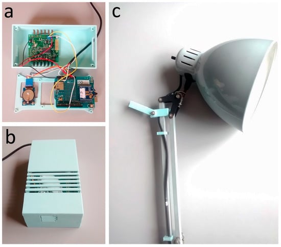 Nearable monitoring and coordination station: (a) internal connection; (b) external case with the slits for the CO2 concentration sensor; (c) the lux sensor as mounted on the desk lamp.