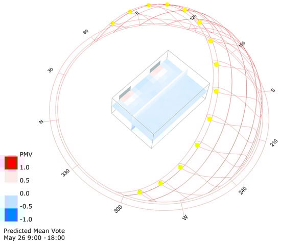 Predicted mean vote (PMV) preliminary analysis for a typical day of the test period: 26 May from 9:00 a.m. to 6:00 p.m.