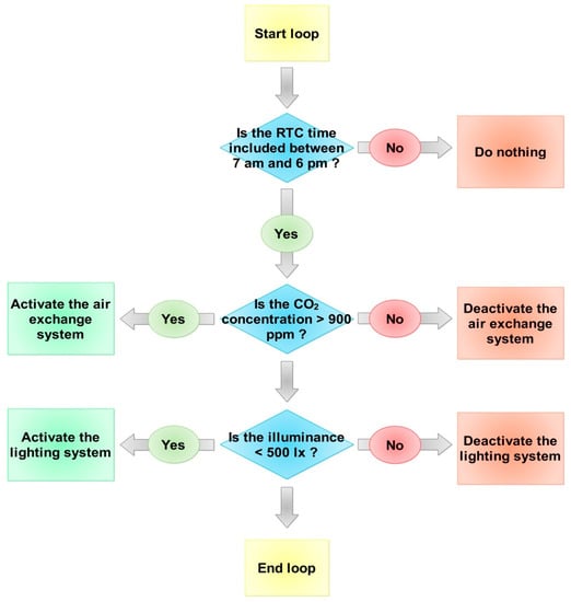 The actuation control logic of the smart lamp allows for management of the lighting and air exchange system in order to optimize both IAQ and ILQ conditions, recording the CO2 concentration and the illuminance values. The device is applied during a working day, between 7:00 a.m. and 6:00 p.m. The control system checks the indoor environmental values and performs an actuation in terms of activation/deactivation of the lighting and air exchange systems, if the recorded values deviate from expectations. Figure 5 shows the control logic of the system.