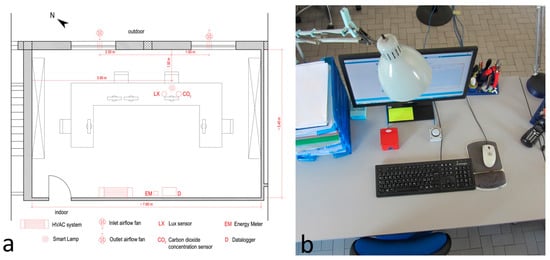 Installation in working conditions: (a) plan of the office; (b) workstation with smart lamp and sensors.