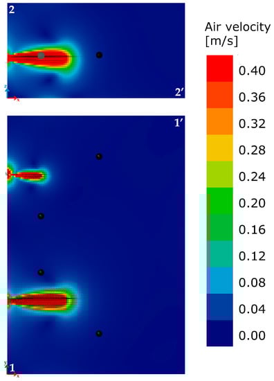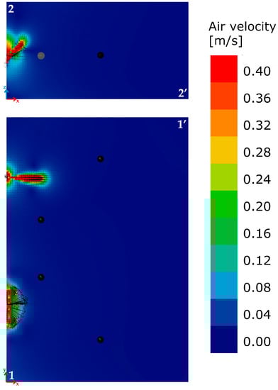 The EN ISO 7730: 2005 provides the typical values of maximum acceptable air velocity differentiating between summer and winter, and considering the type of environment and specific category defined as a function of the vertical air temperature difference: A < 2 °C, B < 3 °C, C < 4 °C. Assuming a scenario mid-season, with an office as “type of building/space” and the category A, as laid down in the standard, the maximum value of the average air speed equal to 0.12 m/s should be met. An overview of the calculated values (Figure 8) highlights how the average air velocity values are lower than the limit value of 0.12 m/s, with two zone of discomfort. Two working positions are close to the area of discomfort. Given the impossibility of moving the points where the two fans are installed, a deflector of about 60 cm × 40 cm in size, tilted by about 35° as to the vertical plane, was installed close to the lower limit of the inlet air hole (Figure 7c) in order to minimize the possible condition of discomfort due to an excessive air speed. It allowed reduction of the two horizontal components of the velocity vectors, increasing the vertical one. The new simulation (Figure 9) highlighted the area affected by the air movement due to inlet flow decreases. In particular, in section 1-1’, a confined area is affected by the movement of air because the deflector contributes to move up the air towards the upper layers, as is clearly shown in section 2-2’.
