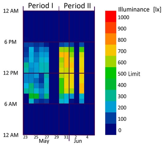 Figure 10 graphically [,,] represents the hourly average values of illuminance. The periods 28–29 May and 4–5 June correspond to Saturday and Sunday, while June 2 is an Italian national holiday (Italian Republic Day). Considering only the working days and the daily operating time frames (form 9:00 a.m. to 6:00 p.m.) the levels of illumination for the first 5 days of period I are below the minimum level (500 lx, “limit” in Figure 10) required by the national standard for activities related to writing, reading, typing and data processing. In the second case, vice-versa, the daily average value is above the minimum value.