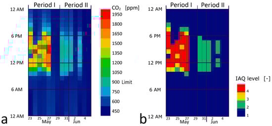 Hourly average data for manual control (period I, 23–29 May) and automatic control (period II, 30 May–5 June): (a) CO2 concentration; (b) indoor air quality level.