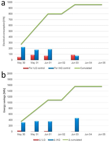 The analysis of the electrical consumption recorded by the energy meter connected to the data logger provides the overall consumption related to the use of this system (Figure 12a). Only period II with automatic control is considered. The daily energy consumption due to lighting is almost constant and below 100 Wh. The consumption related to the air exchange system is almost equal to 200 Wh for the first three days, then on 3 June, when the office was occupied by only one person, the electrical consumption was halved. In Figure 12b the energy savings of the system are reported, considering a comparison with the case when the ventilation and lighting system are run all the time, without a control system. It is clear that the energy saving is due primarily to the air exchanger system control. Over a four-day period of real use, the system allowed a saving of about 1500 Wh.