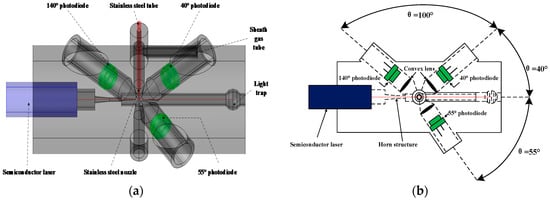 A 3D view of the particle sensor is shown in Figure 1. The main body of the sensor, with the size of 120 mm × 80 mm × 80 mm, is produced by a 3D printer using photosensitive resin. Both the inside and outside walls of the main body are painted with black matt varnish to minimize the reflection of the scattered light and the effect of stray light. A light trap is constructed on the right side to suppress stray light from the light source. A stainless steel tube and a nozzle are introduced to reduce the settlement of particles in the gas tube and to focus the particle flow into the laser beam. The nozzle is also coated with black matt varnish to reduce stray light. A semiconductor laser is used to emit a 648 nm light beam in continuous wave mode. Air flow containing particles enters the optical chamber via the stainless steel tube, where it is illuminated by the laser beam. Scattered light in the scattering angle ranges of 40° ± 30°, 55° ± 30° and 140° ± 30° is captured by three convex lenses and then focused onto three photo-detectors. Akey element of the photo-detectors is photodiode S2386-44K (Si-PD, Hamamatsu Photonics, Hamamatsu, Japan) []. A horn structure is used to prevent the stray light of the laser beam from entering into the particle sensor and to stably maintain the power of the laser beam stable. A sheath gas tube is reserved to protect the optical systems from particle pollution. The diameter of the tube is optimized to ensure small particles can be detected and stray light owing to reflections off surfaces of the tube can be suppressed.