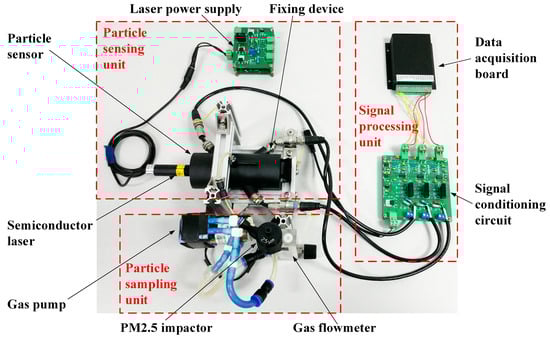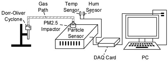 The experimental system is shown in Figure 8.The air is introduced into a PM2.5 impactor through a gas path after filtering the coarse particles using a Dorr-Oliver cyclone. A commercial temperature sensor with a precision of ±0.5 °C and an RH sensor with a precision of ±3% RH are used to measure temperature and RH, respectively. The particle sensor is assembled into a metal chassis, which can effectively suppress electromagnetic interference and environmental noises. The output signals from the particle sensor were acquired using a DAQ (Data Acquisition) card (Daqvantech Inc., Suzhou, China) with a sample rate of 12.5 KHz. Then, the data were processed and displayed on a PC.